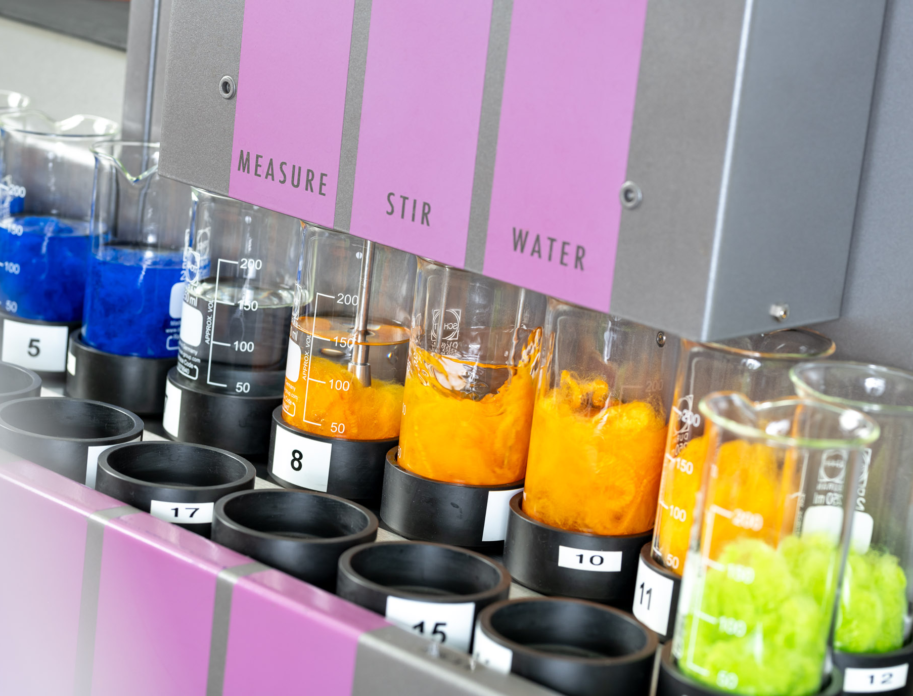 – Denier measurements including dTex, tenacity (cN/tex) and elongation (dpf) – Cutting length measurements (mm) – Crimp measurement (crimp/cm) – Spin oil content measurement (isopropanol) – Colour error management (L*a*b values) – Limiting oxygen index (LOI) measurement – Gas fading test – Thermal shrinkage test – Differential scanning calorimetry (DSC) measurement -Fourier-transform infrared spectroscopy (FTIR) measurement – Melt flow index (MFI) measurement – UV-testing (QUV tester) – UV-testing (Q-Sun tester) – Small lab extruder (including measurements and reports) – SF1000 line (including measurements and reports) – Industrial line (including measurements and reports)